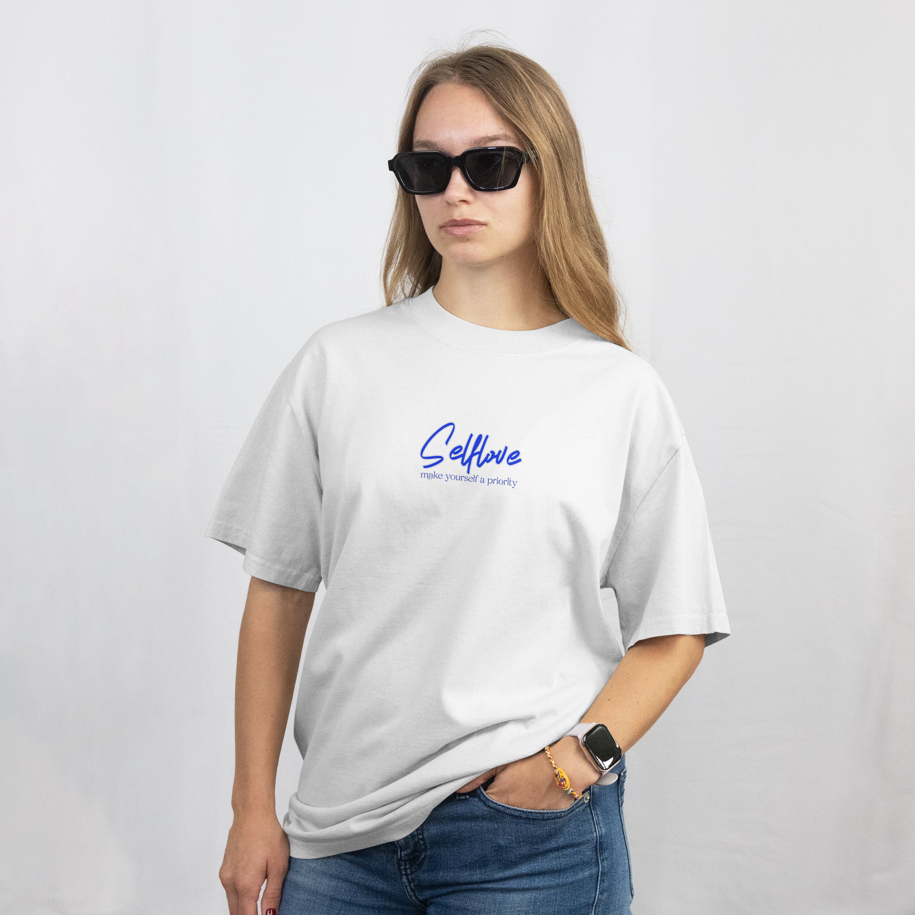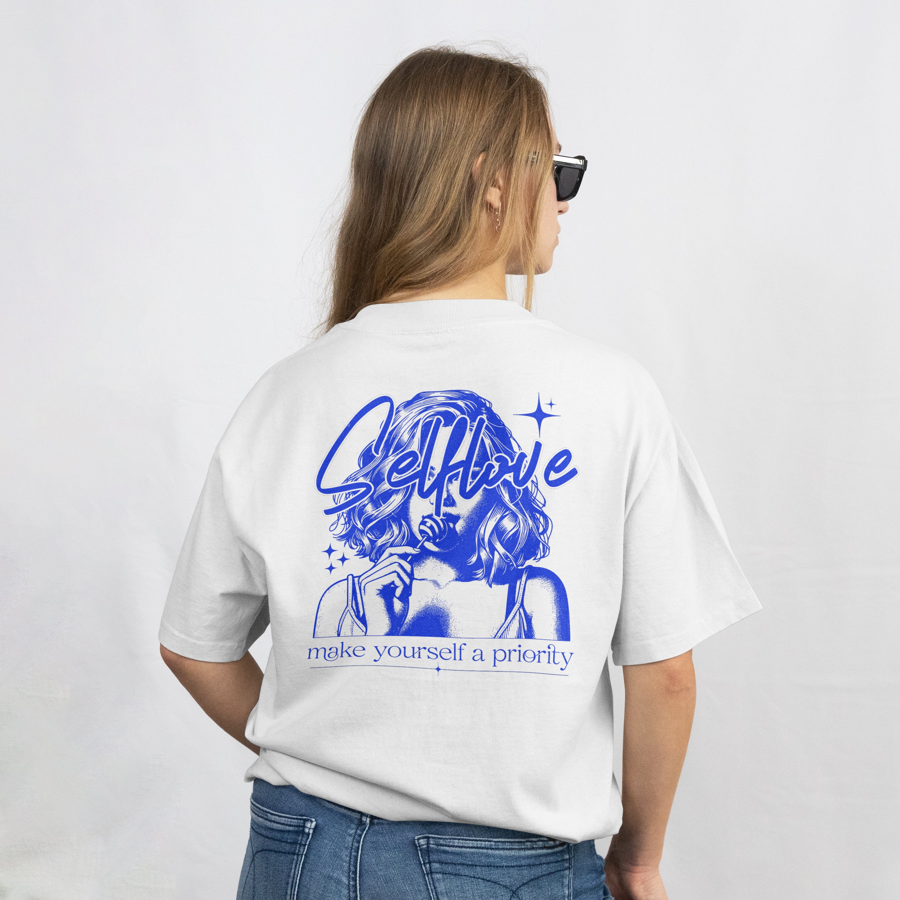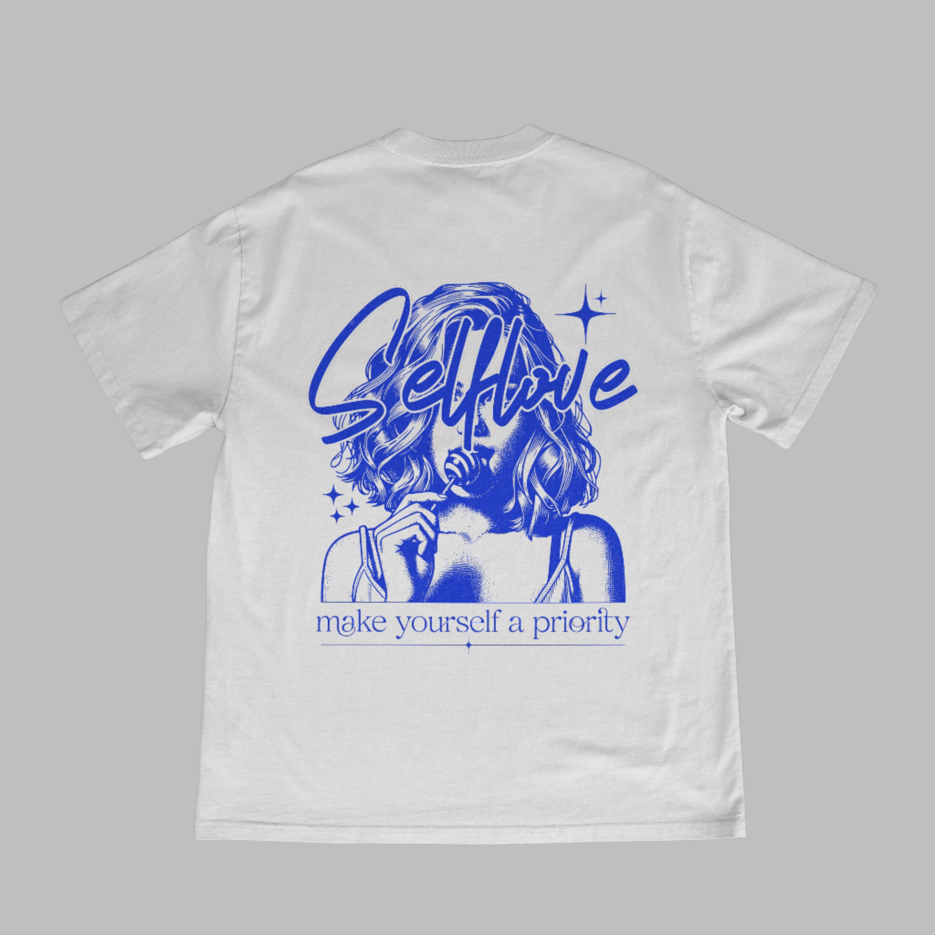 Embrace your individuality with this empowering 180 GSM oversized tee, made from premium 100% cotton for unmatched softness and breathability. Featuring a bold vintage-style graphic that reads “Selflove – Make yourself a priority”, this piece reminds you to put yourself first, always. The relaxed drop-shoulder fit and vibrant blue artwork on crisp white fabric create a standout look that’s equal parts aesthetic and meaningful.